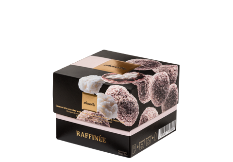 Die getrocknete, -aus ökologischer Landwirtschaft stammende- Kokos aus Sri Lanka wird mit Puffreis und Reissirup vermischt, in eine runde Form gegossen und geröstet. Anschließend umhüllen wir sie in zwei Schichten, zuerst mit dunkle Schokolade und dann mit Himbeer Kuvertüre, und zum Schluss rollen wir die fertigen Dragees in einer Menge Kokosraspeln.